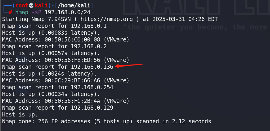 方法2:执行nmap -sP 192.168.0.0/24,扫描网络中活跃的主机。(推荐使用)