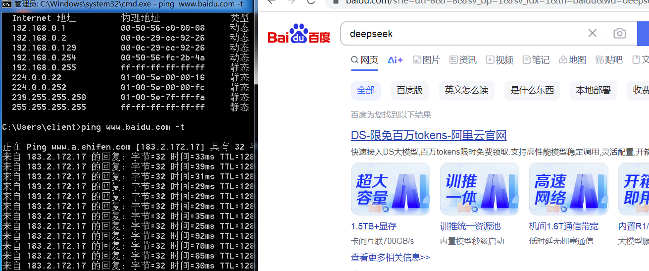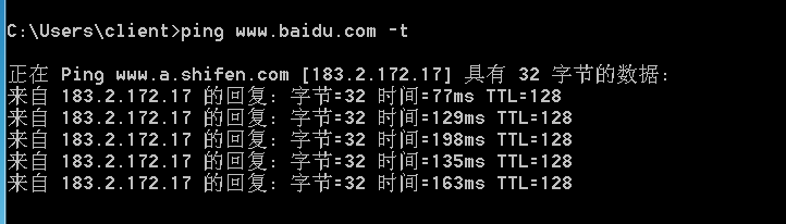 (2)在ARP欺骗前,ping baidu.com -t检查是否能够上网