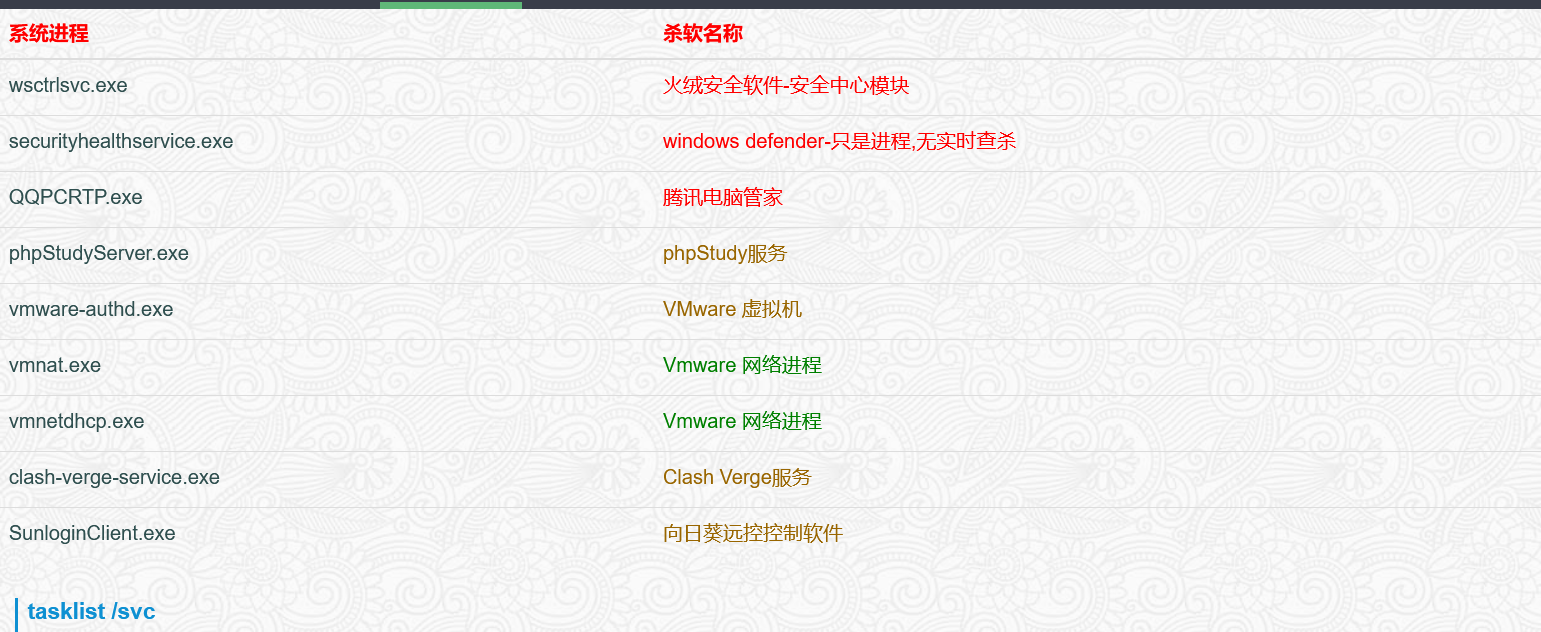 tasklist /v #看看有没有杀软或者一些EDR设备