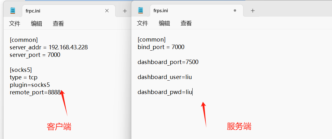 修改frp服务端与客户端配置文件信息,保证隧道搭建成功