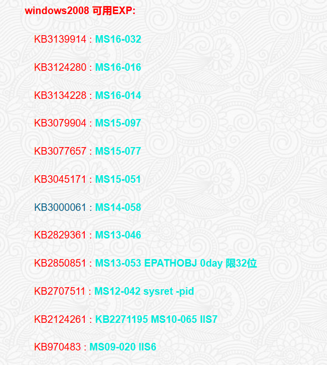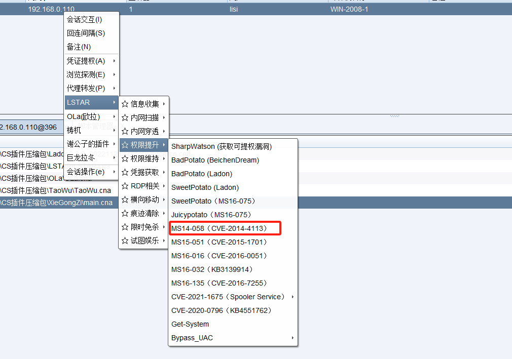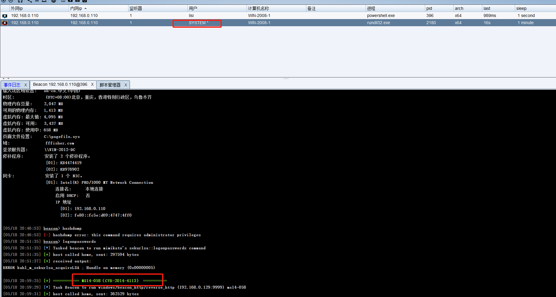 然后根据补丁网站windows2008的每个exp进行提权,可能会失败,最终ms14-058会成功