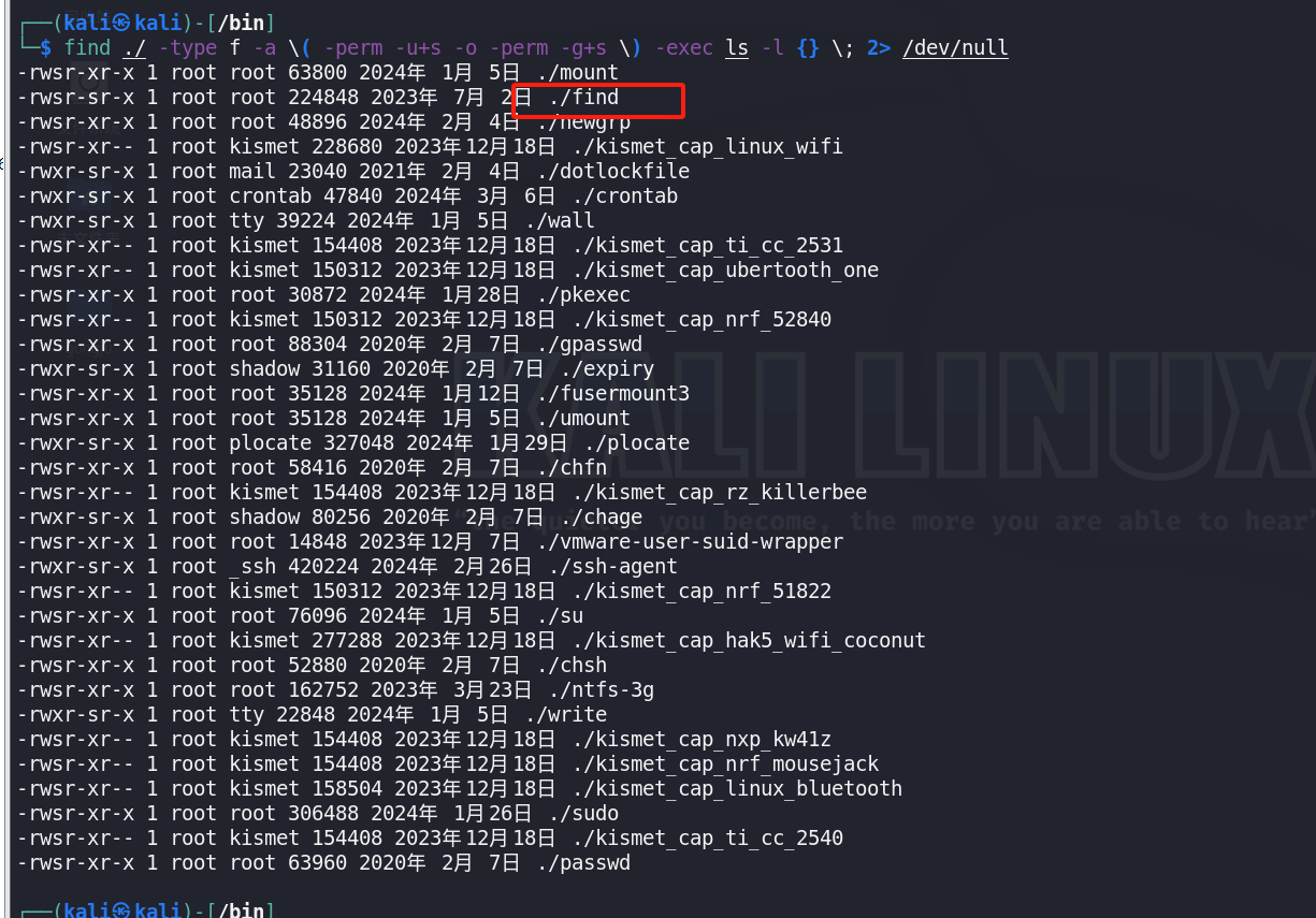 root权限进入/bin目录,给find命令增加suid权限chmod +s find