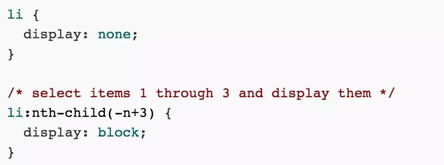 li { display: none; } /* select items 1 through 3 and display them */ li:nth-child(-n+3) { display: block; }