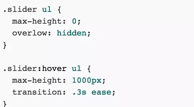 .slider ul { max-height: 0; overlow: hidden; } .slider:hover ul { max-height: 1000px; transition: .3s ease; }