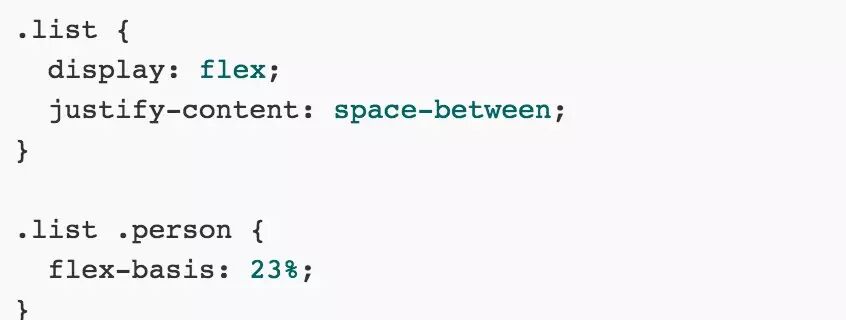 .list { display: flex; justify-content: space-between; } .list .person { flex-basis: 23%; }