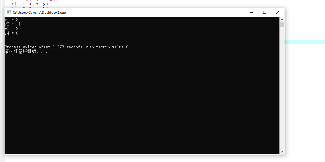 #include <stdio.h> int main() { int x, y; int r1, r2, r3, r4; x = 1; y = 2; r1 = x + y; r2 = x - y; r3 = x * y; r4 = x / y; printf("r1 = %d\n", r1); printf("r2 = %d\n", r2); printf("r3 = %d\n", r3); printf("r4 = %d\n", r4); return 0; }
