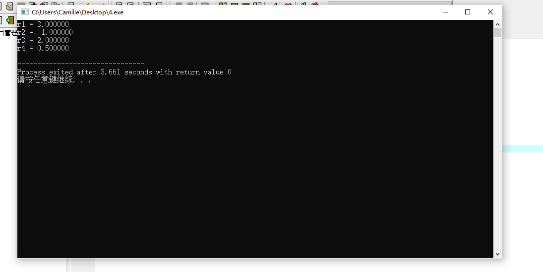 #include <stdio.h> int main() { float x, y; float r1, r2, r3, r4; x = 1; y = 2; r1 = x + y; r2 = x - y; r3 = x * y; r4 = x / y; printf("r1 = %f\n", r1); printf("r2 = %f\n", r2); printf("r3 = %f\n", r3); printf("r4 = %f\n", r4); return 0; }
