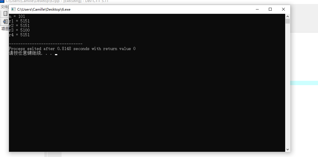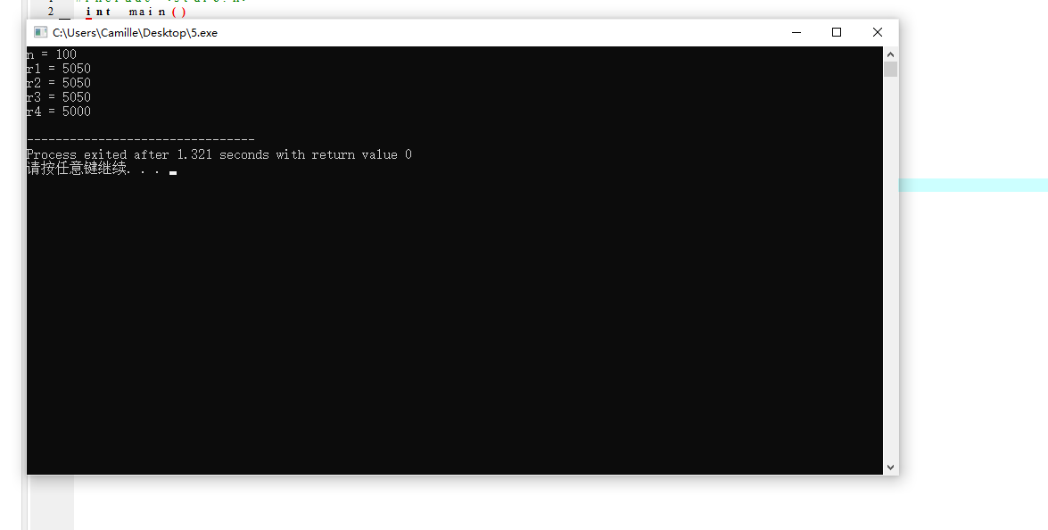 #include <stdio.h> int main() { int n, r1, r2, r3, r4; n = 101; r1 = n*(n+1)/2; r2 = (n+1)*n/2; r3 = n/2*(n+1); r4 = (n+1)/2*n; printf("n = %d\n", n); printf("r1 = %d\n", r1); printf("r2 = %d\n", r2); printf("r3 = %d\n", r3); printf("r4 = %d\n", r4); return 0; }