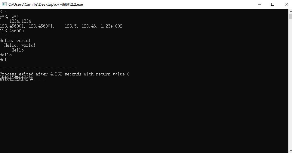 #include <stdio.h> int main() { int x=1234; float f=123.456; double m=123.456; char ch='a'; char a[]="Hello, world!"; int y=3, z=4; printf("%d %d\n", y, z); printf("y=%d, z=%d\n", y,z); printf("%8d,%2d\n", x,x); printf("%f, %8f, %8.1f, %0.2f, %.2e\n",f,f,f,f,f); printf("%lf\n",m); printf("%3c\n", ch); printf("%s\n%15s\n%10.5s\n%2.5s\n%.3s\n",a,a,a,a,a); return 0; }