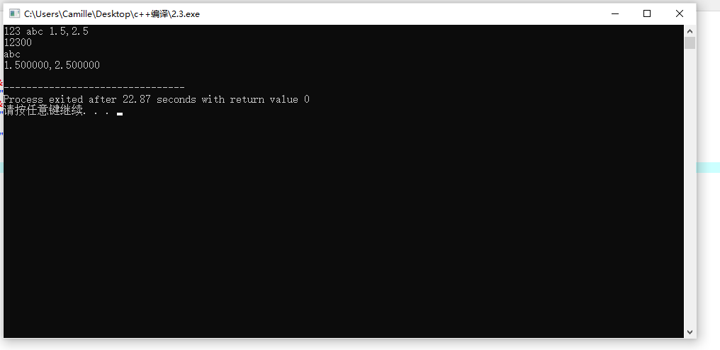 #include <stdio.h> int main() { double x,y; char c1,c2,c3; int a1,a2,a3; scanf("%d%d%d",&a1,&a2,&a3); printf("%d%d%d\n",a1,a2,a3); scanf("%c%c%c",&c1,&c2,&c3); printf("%c%c%c\n",c1,c2,c3); scanf("%lf,%lf",&x,&y); printf("%f,%lf\n",x,y); return 0; }