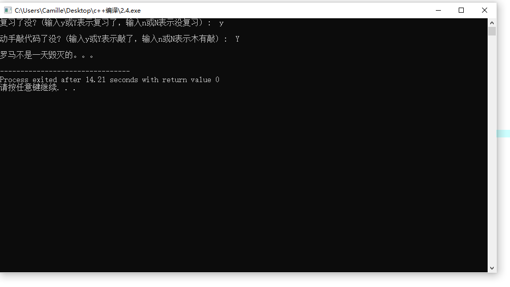#include <stdio.h> int main() { char ans1, ans2; printf("复习了没? (输入y或Y表示复习了,输入n或N表示没复习) : "); ans1 = getchar(); getchar(); printf("\n动手敲代码了没? (输入y或Y表示敲了,输入n或N表示木有敲) : "); ans2 = getchar(); if(ans1=='y'&&ans2=='y'||ans1=='Y'&&ans2=='Y') printf("\n罗马不是一天建成的:)\n"); else printf("\n罗马不是一天毁灭的。。。\n"); return 0; }