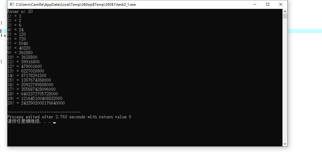 #include <stdio.h> long long fac(int n); int main() { int i,n; printf("Enter n: "); scanf("%d", &n); for(i=1; i<=n; ++i) printf("%d! = %lld\n", i, fac(i)); return 0; } long long fac(int n) { static long long p = 1; p = p*n; return p; }