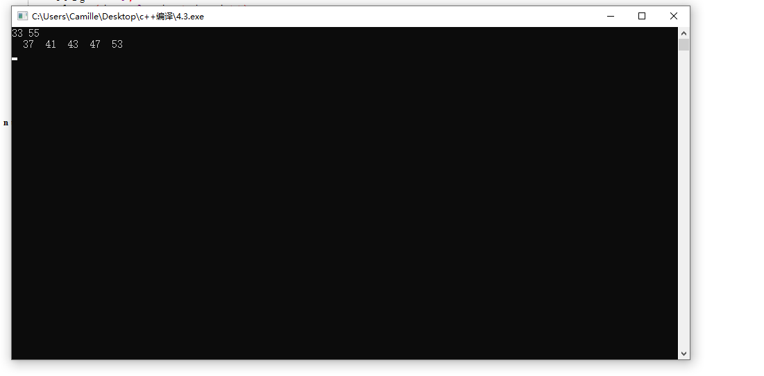 #include<stdio.h> #define N 1000 int fun(int n, int m, int bb[N]) { int i, j, k = 0, flag; for (j = n; j <= m; j++) { flag = 1; for (i = 2; i < j; i++) if (j % i == 0) { flag = 0; break; } if (flag == 1) bb[k++] = j; } return k; } int main() { int n = 0, m = 0, i, k, bb[N]; while (scanf("%d %d", &n, &m) != EOF) { for (i = 0; i < m - n; i++) bb[i] = 0; k = fun(n, m, bb); for (i = 0; i < k; i++) printf("%4d", bb[i]); printf("\n"); } return 0; }
