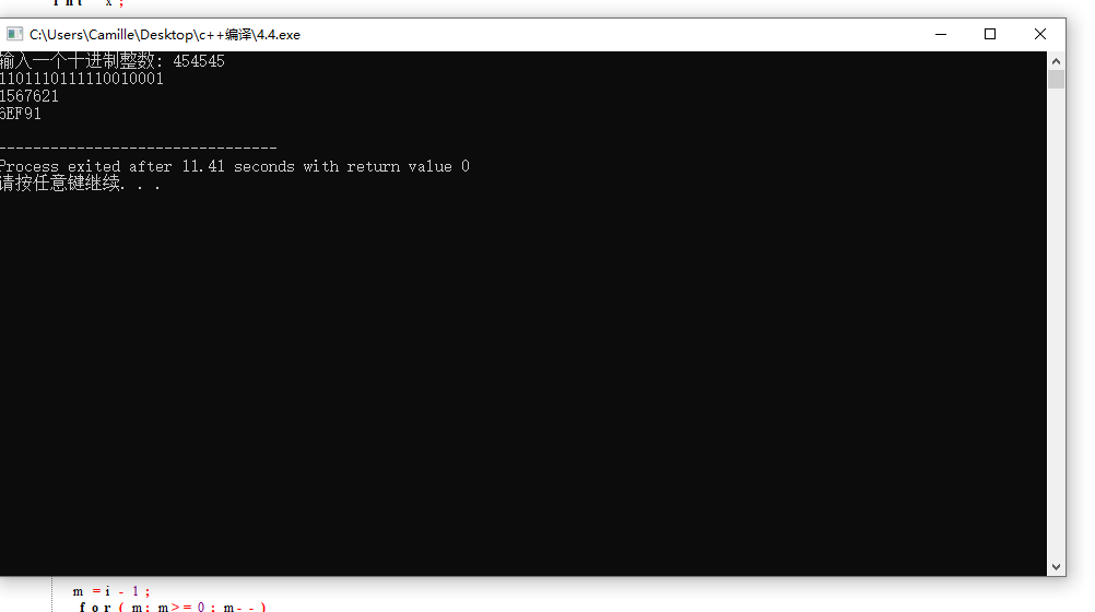 #include <stdio.h> void dec2n(int x, int n); int main() { int x; printf("输入一个十进制整数: "); scanf("%d", &x); dec2n(x, 2); // 函数调用: 把x转换成二进制输出 dec2n(x, 8); // 函数调用: 把x转换成八进制输出 dec2n(x, 16); // 函数调用: 把x转换成十六进制输出 return 0; } void dec2n(int x, int n) { int a[100]; int i=0,m; do{ a[i]=x%n; x=x/n; i++; }while(x!=0); if(a[i]>9){ switch(a[i]){ case 10:a[i]='A';break; case 11:a[i]='B';break; case 12:a[i]='C';break; case 13:a[i]='D';break; case 14:a[i]='E';break; case 15:a[i]='F';break; } } m=i-1; for(m;m>=0;m--) printf("%X",a[m]); printf("\n"); }