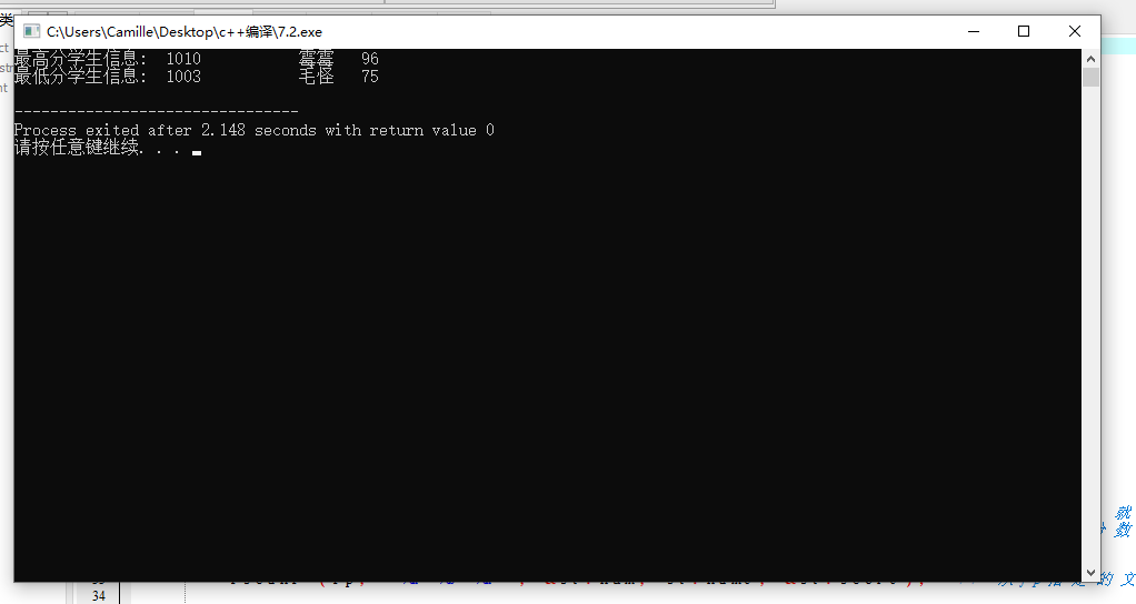 // 从文本文件file1.dat中读取数据,找出最高分和最低分学生信息,并输出在屏幕上 // 这是《C语言程序设计教程学习指导》「2.10 文件」中的实验,细微处做了微调 // 这个源代码没有考虑多个高分或多个低分的情形。 #include <stdio.h> #include <stdlib.h> #define N 10 // 定义一个结构体类型STU typedef struct student { int num; char name[20]; int score; }STU; int main() { STU st, stmax, stmin; int i; FILE *fp; // 以只读文本方式打开文件file1.dat fp = fopen("file1.dat", "r"); if( !fp ) { // 如果打开失败,则输出错误提示信息,然后退出程序 printf("fail to open file1.dat\n"); exit(0); } stmax.score = 0; // 先假定最高分是0,后面如发现比当前最高分还高的分数,就更新最高分 stmin.score = 100; // 先假定最低分是100分,后面如发现比当前最低分更低的分数,就更新最低分 for(i=0; i<N; i++) { fscanf(fp, "%d %s %d", &st.num, st.name, &st.score); // 从fp指定的文件中格式化读取一个学生信息 if(st.score > stmax.score) stmax = st; else if(st.score < stmin.score) stmin = st; } fclose(fp); printf("最高分学生信息: %5d%15s%5d\n", stmax.num, stmax.name, stmax.score); printf("最低分学生信息: %5d%15s%5d\n", stmin.num, stmin.name, stmin.score); return 0; }