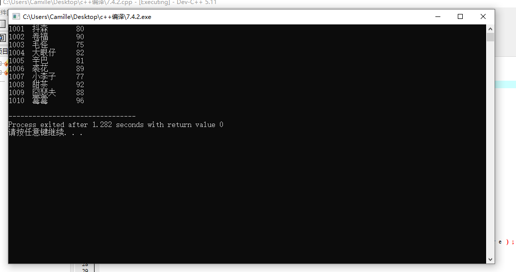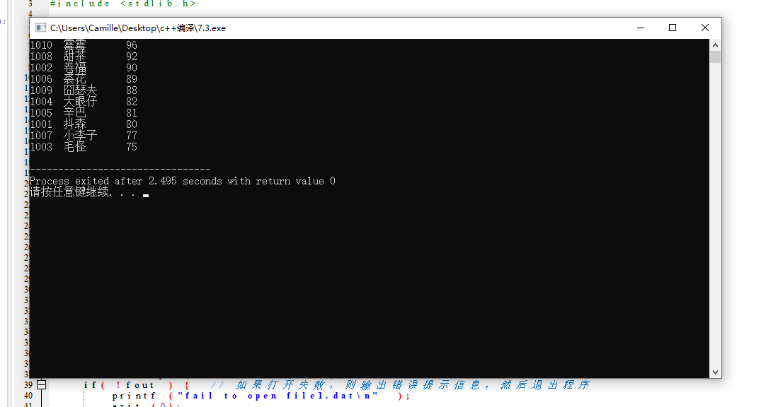 // 从文本数据文件file1.dat中读入数据,按成绩从高到低排序,并将排序结果输出到屏幕上,同时,也以二进制方式存入文件file4.dat中。 #include <stdio.h> #include <stdlib.h> #define N 10 // 定义一个结构体类型STU typedef struct student { int num; char name[20]; int score; }STU; void sort(STU *pst, int n); // 函数声明 int main() { FILE *fin, *fout; STU st[N]; int i; // 以只读文本方式打开文件file1.dat fin = fopen("file1.dat", "r"); if( !fin ) { // 如果打开失败,则输出错误提示信息,然后退出程序 printf("fail to open file1.dat\n"); exit(0); } // 从fin指向的数据文件file1.dat中读取数据到结构体数组st for(i=0; i<N; i++) fscanf(fin, "%d %s %d", &st[i].num, st[i].name, &st[i].score); fclose(fin); // 关闭fin指向的文件file1.dat // 调用函数sort()对数组st中数据,按分数由高到低排序 sort(st, N); // 以写方式打开/创建二进制文件file4.dat fout = fopen("file4.dat", "wb"); if( !fout ) { // 如果打开失败,则输出错误提示信息,然后退出程序 printf("fail to open file1.dat\n"); exit(0); } // 将排序后的数组st中数据输出到屏幕 for(i=0; i<N; i++) printf("%-6d%-10s%3d\n", st[i].num, st[i].name, st[i].score); // 将排序后的数组st中数据写到二进制文件file4.dat fwrite(st, sizeof(STU), N, fout); // 将从地址st开始的sizeof(STU)×N个字节信息写入fout指向的文件file4.dat中 fclose(fout); // 关闭fout指向的文件file4.dat return 0; } // 函数功能描述:对pst指向的n个STU结构体数据进行排序,按成绩数据项由高到底排序 // 排序算法:选择排序算法 void sort(STU *pst, int n) { STU *pi, *pj, t; for(pi = pst; pi < pst+n-1; pi++) for(pj = pi+1; pj < pst+n; pj++) if(pi->score < pj->score) { t = *pi; *pi = *pj; *pj = t; } }