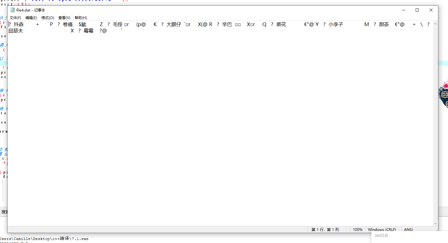 #include <stdio.h> #include <stdlib.h> #define N 10 // 定义一个结构体类型STU typedef struct student { int num; char name[20]; int score; }STU; int main() { FILE *fin, *fout; STU st[N]; int i; fin = fopen("file1.dat", "r"); if( !fin ) { // 如果打开失败,则输出错误提示信息,然后退出程序 printf("fail to open file1.dat\n"); exit(0); } for(i=0; i<N; i++) fscanf(fin, "%d %s %d", &st[i].num, st[i].name, &st[i].score); fclose(fin); // 以写方式打开/创建二进制文件file4.dat fout = fopen("file4.dat", "wb"); if( !fout ) { // 如果打开失败,则输出错误提示信息,然后退出程序 printf("fail to open file1.dat\n"); exit(0); } // 将数组st中数据输出到屏幕 for(i=0; i<N; i++) printf("%-6d%-10s%3d\n", st[i].num, st[i].name, st[i].score); fwrite(st, sizeof(STU), N, fout); fclose(fout); // 关闭fout指向的文件file4.dat return 0; }