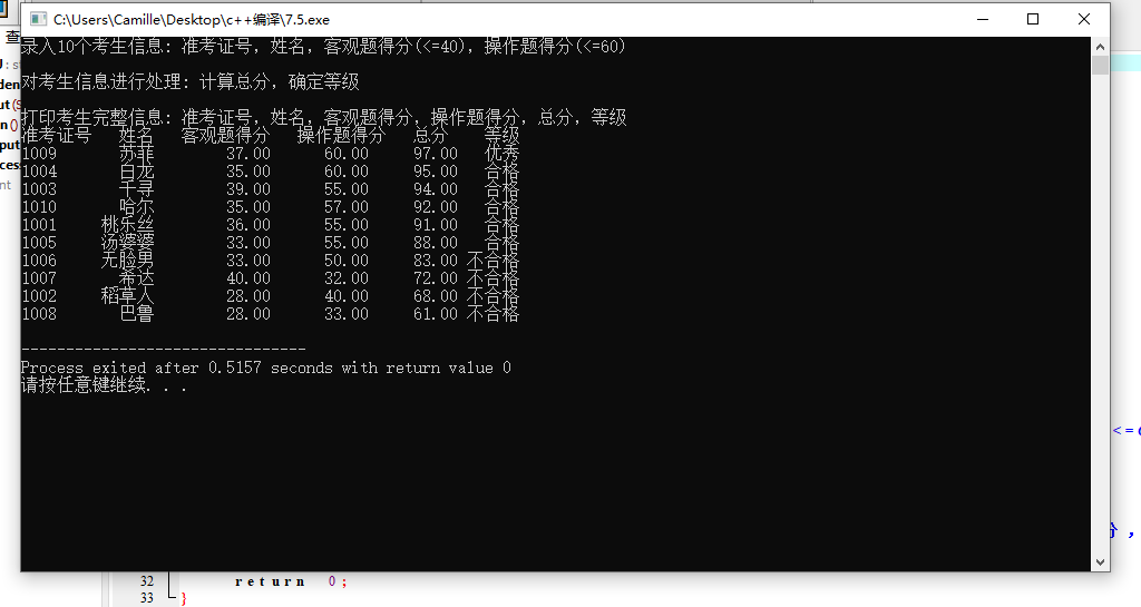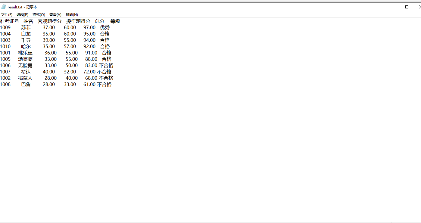 #include <stdio.h> #include <string.h> #include <stdlib.h> const int N = 10; // 定义结构体类型struct student,并定义其别名为STU typedef struct student { long int id; char name[20]; float objective; /*客观题得分*/ float subjective; /*操作题得分*/ float sum; char level[10]; }STU; // 函数声明 void input(STU s[], int n); void output(STU s[], int n); void process(STU s[], int n); int main() { STU stu[N]; FILE *fin, *fout; printf("录入%d个考生信息: 准考证号,姓名,客观题得分(<=40),操作题得分(<=60)\n", N); input(stu, N); printf("\n对考生信息进行处理: 计算总分,确定等级\n"); process(stu, N); printf("\n打印考生完整信息: 准考证号,姓名,客观题得分,操作题得分,总分,等级\n"); output(stu, N); return 0; } // 从文本文件examinee.txt读入考生信息:准考证号,姓名,客观题得分,操作题得分 void input(STU s[], int n) { FILE *fin; int i; fin = fopen("examinee.txt", "r"); if( !fin ) { // 如果打开失败,则输出错误提示信息,然后退出程序 printf("fail to open examinee.txt\\n"); exit(0); } for(i=0; i<n; i++) fscanf(fin, "%ld %s %f %f", &s[i].id, s[i].name, &s[i].objective,&s[i].subjective); fclose(fin); } // 输出考生完整信息: 准考证号,姓名,客观题得分,操作题得分,总分,等级 // 不仅输出到屏幕上,还写到文本文件result.txt中 void output(STU s[], int n) { FILE*fout,*fin; int i; fout = fopen("result.txt", "w"); if( !fout ) { // 如果打开失败,则输出错误提示信息,然后退出程序 printf("fail to open result.txt\n"); exit(0); } printf("准考证号 姓名 客观题得分 操作题得分 总分 等级"); printf("\n"); for(i=0; i<n; i++) { printf("%4ld %10s %12.2f %10.2f %9.2f %6s\n",s[i].id,s[i].name,s[i].objective,s[i].subjective,s[i].sum,s[i].level); } fprintf(fout,"准考证号 姓名 客观题得分 操作题得分 总分 等级\n"); for(i=0; i<n; i++){ fprintf(fout,"%4ld %10s %12.2f %1.2f %9.2f %6s\n",s[i].id,s[i].name,s[i].objective,s[i].subjective,s[i].sum,s[i].level ); } fclose(fout); } // 对考生信息进行处理:计算总分,排序,确定等级 void process(STU s[], int n) { { int i,j; for(i=0;i<n;i++) s[i].sum=s[i].objective+s[i].subjective; //计算总分 STU temp; for(i=0;i<n-1;i++) for(j=0;j<n-1-i;j++) if(s[j].sum<s[j+1].sum) { temp = s[j]; s[j] = s[j+1]; s[j+1] = temp;//冒泡排序,降序 } for(i=0;i<n;i++){ if(i<1) strcpy(s[i].level,"优秀"); else if(i>=1&&i<=5) strcpy(s[i].level,"合格"); else strcpy(s[i].level,"不合格"); } } }