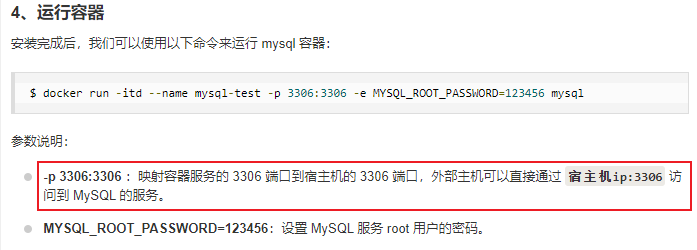 去菜鸟教程发现这么一段,嗯...官网的应该是少了 -p:3306:3306
