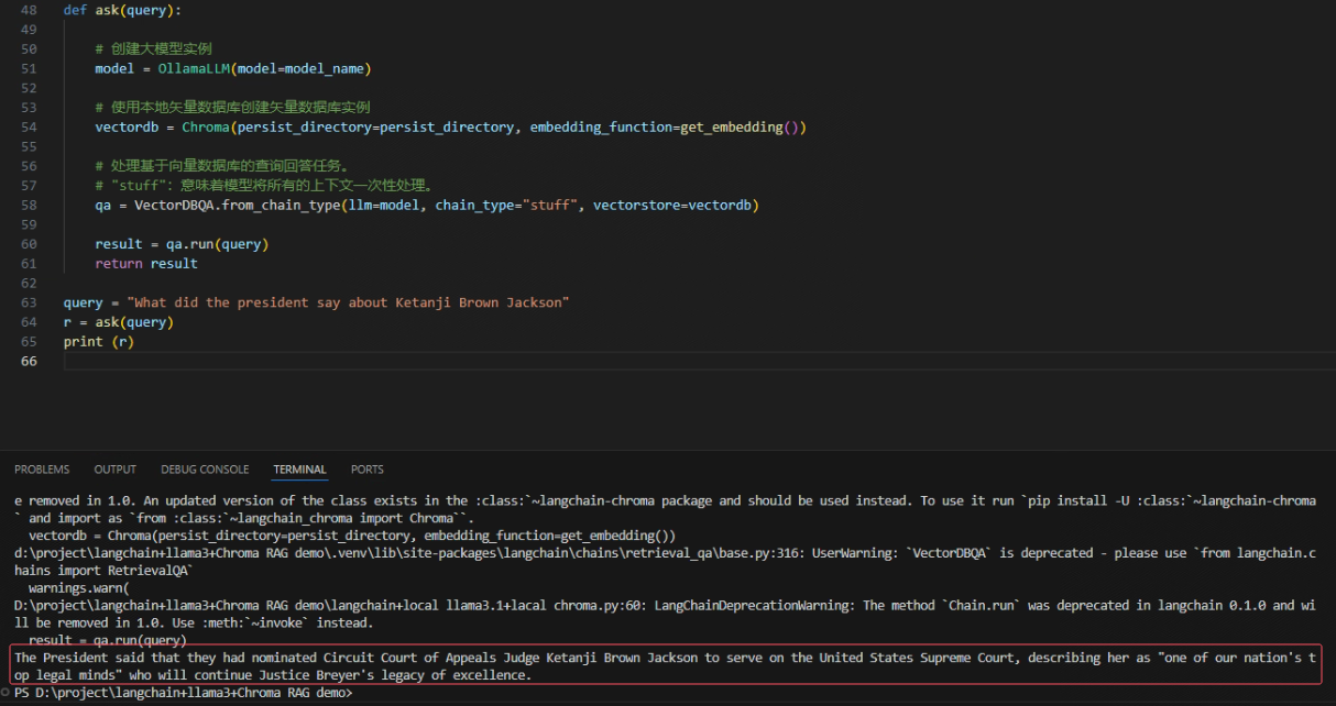 def ask(query): # 创建大模型实例 model = OllamaLLM(model=model_name) # 使用本地矢量数据库创建矢量数据库实例 vectordb = Chroma(persist_directory=persist_directory, embedding_function=get_embedding()) # 处理基于向量数据库的查询回答任务。 # "stuff":意味着模型将所有的上下文一次性处理。 qa = VectorDBQA.from_chain_type(llm=model, chain_type="stuff", vectorstore=vectordb) result = qa.run(query) return result query = "What did the president say about Ketanji Brown Jackson" r = ask(query) print (r)