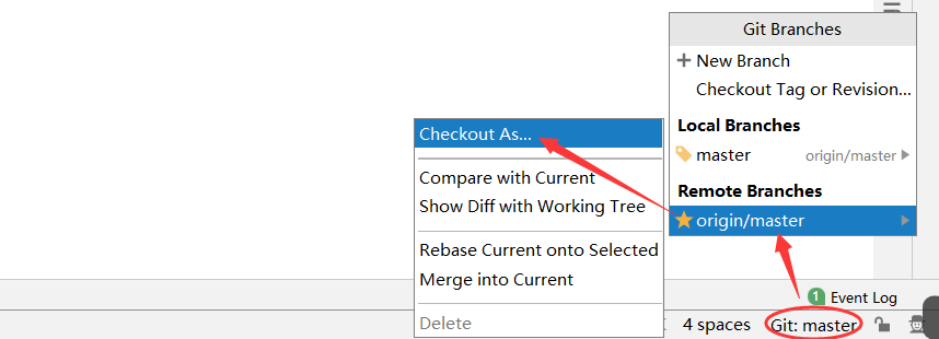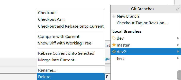 - 点击dev分支右面的箭头,在展开的菜单中选择