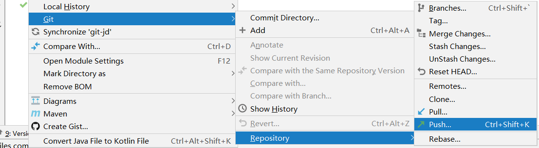 选择项目/文件---右键---Git--Commit(记录到版本库的文件--黑色)