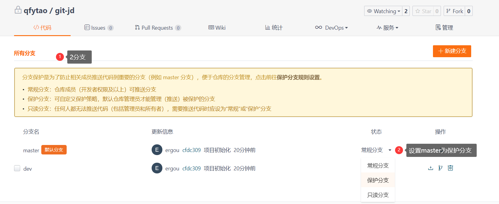 - 每个分支可以进行单独管理(常规分支、保护分支、只读分支)
