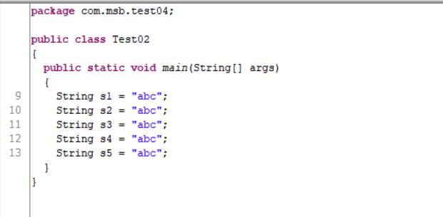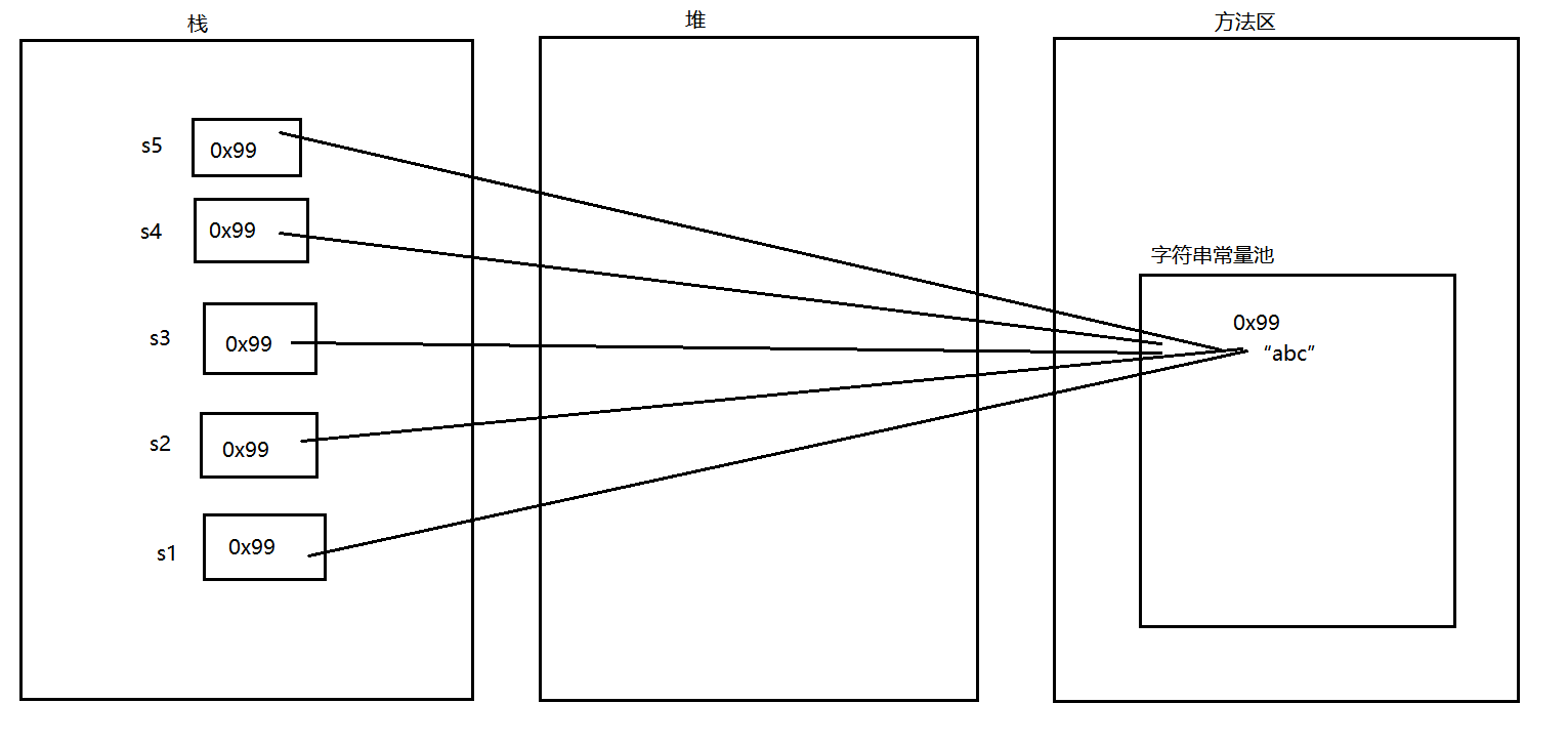 然后在常量池中,常量池的特点是第一次如果没有这个字符串,就放进去,如果有这个字符串,就直接从常量池中取: