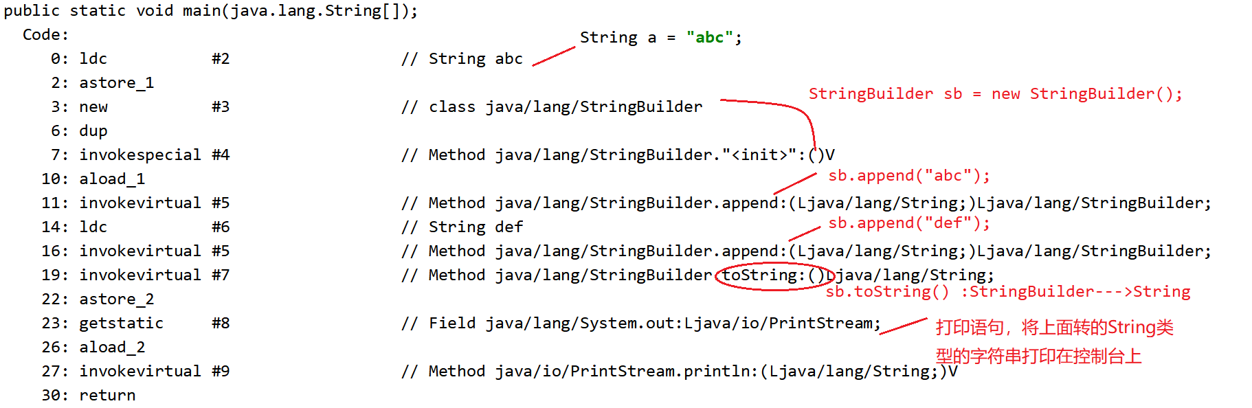 上面的字符串,会进行编译器优化,直接合并成为完整的字符串,我们可以反编译验证: