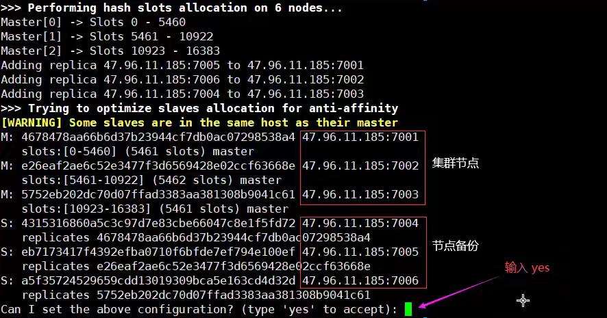redis-cli --cluster create 公网ip:7001 ...公网ip:7006 --cluster -replicas 1
