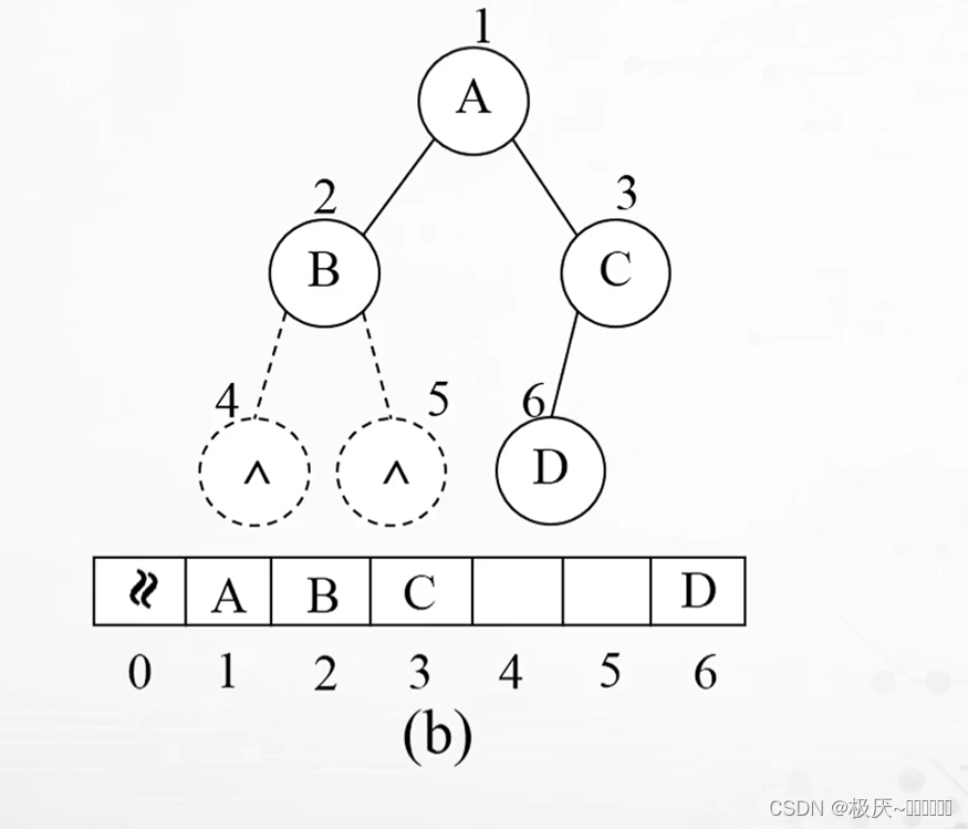 把二叉树的结点按照完全二叉树的顺序编号规则自上而下、自左至右依次存放在一组地址连续的存储单元里构成了二叉树的顺序存储,树中结点的编号就可以唯一地反映出结点之间的逻辑关系。