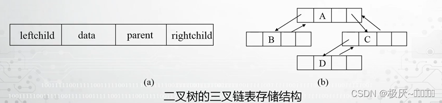 在三叉链表表示中,双亲结点有指向其孩子结点的指针,而孩子结点也包含指向其双亲结点的指针。