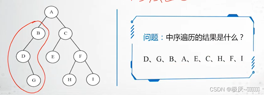 中序遍历递归方式定义:对于一棵二叉树,先访问根结点左子树,再访问根结点,最后右子树;对于左、右子树中的结点仍然按照中序遍历访问。