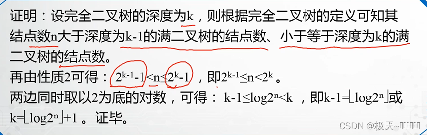 - 具有n个结点的完全二叉树其深度为⌊㏒2ⁿ⌋+1 (其中⌊㏒2ⁿ⌋表示不大于㏒2ⁿ的最大整数)。