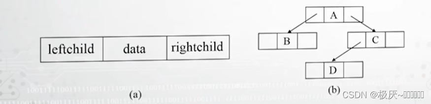 二叉树中每个结点最多有两个孩子,因此在一个结点中设置两个指针域leftchild和rightchild分别指向其左孩子和右孩子,数据域data用于存放每个结点中数据元素的值。