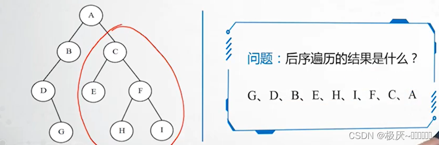 后序遍历递归方式定义:对于一棵二叉树,先访问根结点的左子树,后访问右子树,最后访问根结点;对于左、右子树中的结点仍按照后序遍历的方式访问。