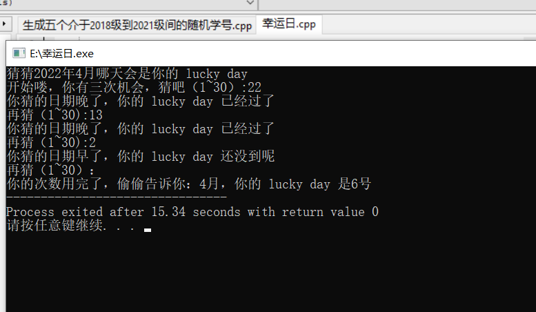 printf("\n你的次数用完了,偷偷告诉你:4月,你的 lucky day 是%d号",luckyday);