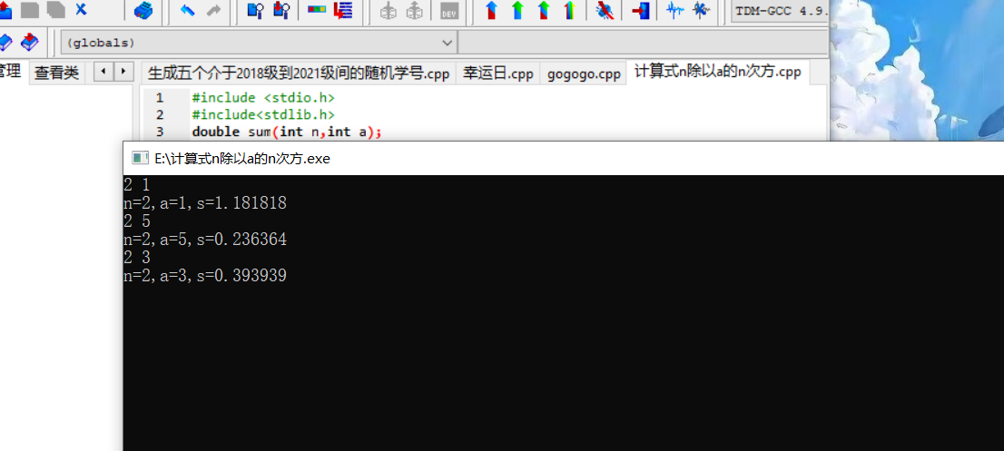printf("n=%d,a=%d,s=%lf\n",n,a,sum(n,a));
