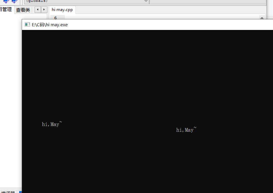 #include<stdio.h> #include<stdlib.h> #include<time.h> #include<unistd.h> #define N 80 void printText(int line,int col,char text[]); void printSpaces(int n); void printBlankLines(int n); int main() { int line,col,i; char text[N]="hi,May~"; srand(time(0)); for(i=1;i<=10;++i) { line=rand()%25; col=rand()%80; printText(line,col,text); sleep(1); } return 0; } void printSpaces(int n) { int i; for(i=1;i<=n;++i) printf(" "); } void printBlankLines(int n) { int i; for(i=1;i<=n;++i) printf("\n"); } void printText(int line,int col,char text[]) { printBlankLines(line-1); printSpaces(col-1); printf("%s",text); }