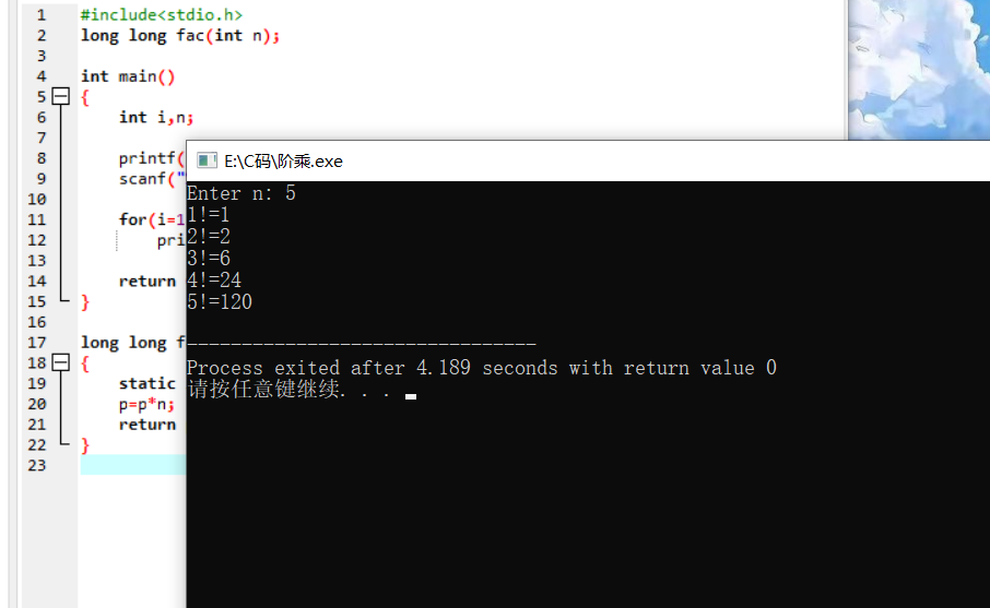 #include<stdio.h> long long fac(int n); int main() { int i,n; printf("Enter n: "); scanf("%d",&n); for(i=1;i<=n;++i) printf("%d!=%lld\n",i,fac(i)); return 0; } long long fac(int n) { static long long p=1; p=p*n; return p; }