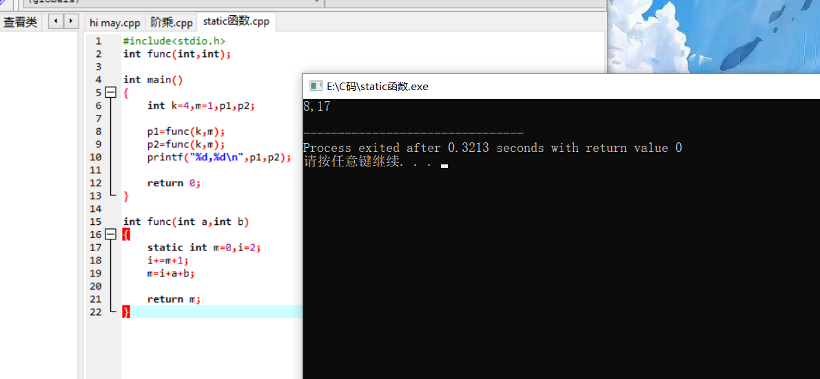 #include<stdio.h> int func(int,int); int main() { int k=4,m=1,p1,p2; p1=func(k,m); p2=func(k,m); printf("%d,%d\n",p1,p2); return 0; } int func(int a,int b) { static int m=0,i=2; i+=m+1; m=i+a+b; return m; }