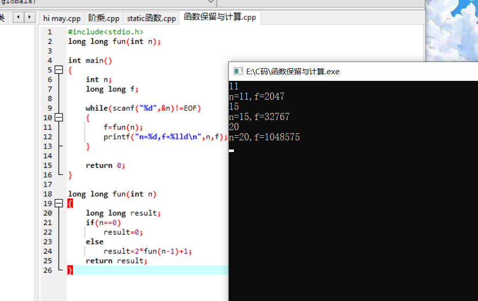 #include<stdio.h> long long fun(int n); int main() { int n; long long f; while(scanf("%d",&n)!=EOF) { f=fun(n); printf("n=%d,f=%lld\n",n,f); } return 0; } long long fun(int n) { long long result; if(n==0) result=0; else result=2*fun(n-1)+1; return result; }