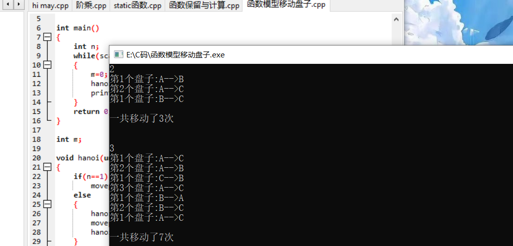 #include<stdio.h> void hanoi(unsigned int n,char from,char temp,char to); void moveplate(unsigned int n,char from,char to); extern int m; int main() { int n; while(scanf("%u",&n)!=EOF) { m=0; hanoi(n,'A','B','C'); printf("\n一共移动了%d次\n\n",m); } return 0; } int m; void hanoi(unsigned int n,char from,char temp,char to) { if(n==1) moveplate(n,from,to); else { hanoi(n-1,from,to,temp); moveplate(n,from,to); hanoi(n-1,temp,from,to); } } void moveplate(unsigned int n,char from,char to) { printf("第%u个盘子:%c-->%c\n",n,from,to); m++; }