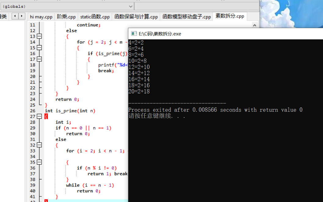 #include<stdio.h> #include<math.h> #include<stdlib.h> int is_prime(int n); int main() { int m,j; for (m = 4; m <= 20; ++m) { if (m % 2 != 0) continue; else { for (j = 2; j < m - 1; ++j) { if (is_prime(j) && is_prime(m - j)) { printf("%d=%d+%d\n", m, j, m - j); break; } } } } return 0; } int is_prime(int n) { int i; if (n == 0 || n == 1) return 0; else { for (i = 2; i < n - 1; ++i) { if (n % i != 0) return 1; break; } while (i == n - 1) return 0; } }