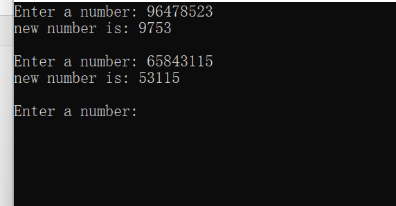 #include<stdio.h> long fun(long s); int main() { long s,t; printf("Enter a number: "); while(scanf("%ld",&s)!=EOF) { t=fun(s); printf("new number is:%ld\n\n",t); printf("Enter a number: "); } return 0; } long fun(long s) { long i,p=0,n=1; while(s!=0) { i=s%10; if(i%2!=0) { p=n*i+p; n*=10; } s=s/10; } return p; }