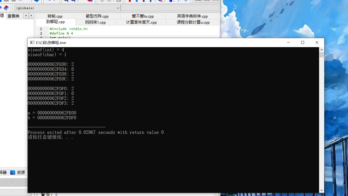 #include <stdio.h> #define N 4 int main() { int a[N] = {2, 0, 2, 2}; char b[N] = {'2', '0', '2', '2'}; int i; printf("sizeof(int) = %d\n", sizeof(int)); printf("sizeof(char) = %d\n", sizeof(char)); printf("\n"); // 输出数组a中每个元素的地址、值 for (i = 0; i < N; ++i) printf("%p: %d\n", &a[i], a[i]); printf("\n"); // 输出数组b中每个元素的地址、值 for (i = 0; i < N; ++i) printf("%p: %c\n", &b[i], b[i]); printf("\n"); // 输出数组名a和b对应的值 printf("a = %p\n", a); printf("b = %p\n", b); return 0 }