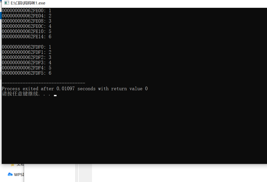 #include <stdio.h> #define N 2 #define M 3 int main() { int a[N][M] = {{1, 2, 3}, {4, 5, 6}}; char b[N][M] = {{'1', '2', '3'}, {'4', '5', '6'}}; int i, j; // 输出二维数组a中每个元素的地址和值 for (i = 0; i < N; ++i) for (j = 0; j < M; ++j) printf("%p: %d\n", &a[i][j], a[i][j]); printf("\n"); // 输出二维数组a中每个元素的地址和值 for (i = 0; i < N; ++i) for (j = 0; j < M; ++j) printf("%p: %c\n", &b[i][j], b[i][j]); return 0; }