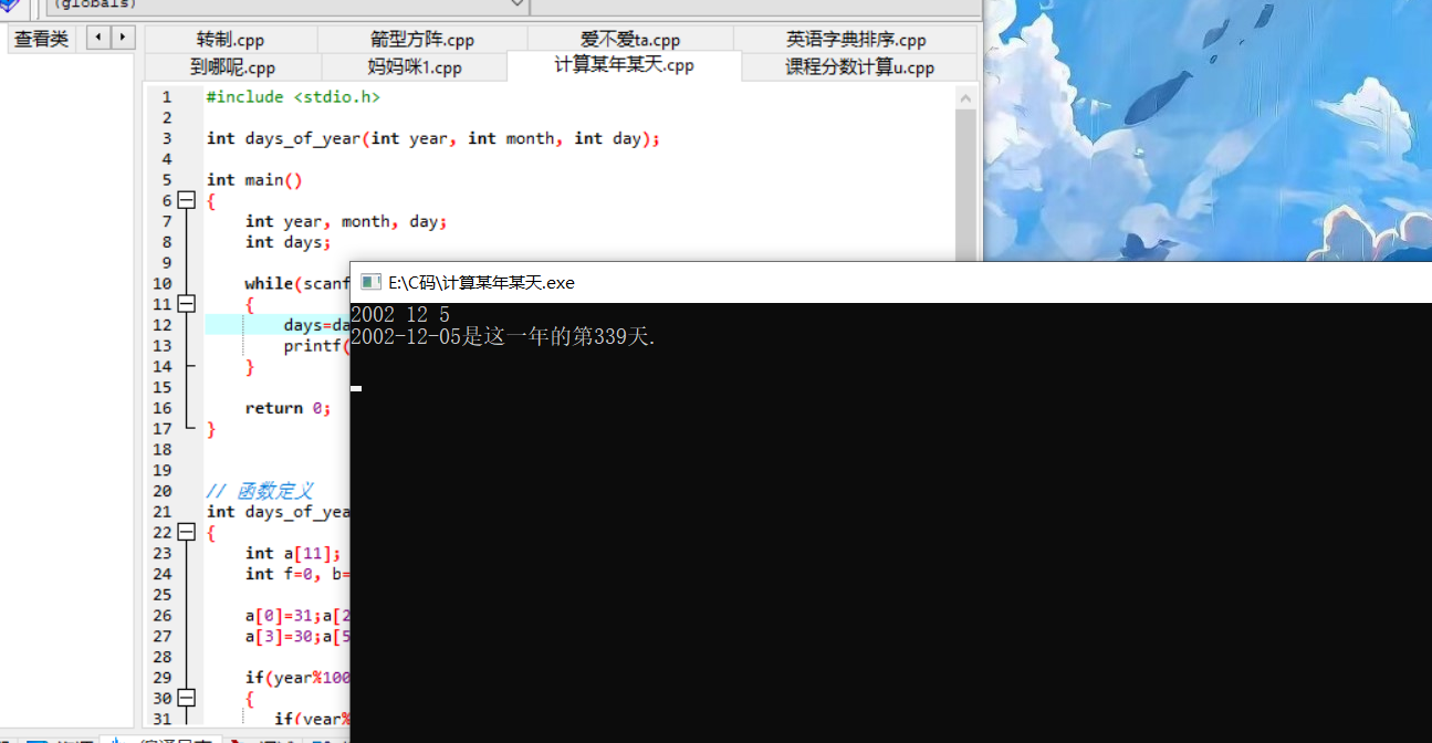 #include <stdio.h> int days_of_year(int year, int month, int day); int main() { int year, month, day; int days; while(scanf("%d%d%d", &year, &month, &day) != EOF) { days=days_of_year(year, month, day); printf("%4d-%02d-%02d是这一年的第%d天.\n\n", year, month, day, days); } return 0; } // 函数定义 int days_of_year(int year, int month, int day) { int a[11]; int f=0, b=0, c=0, sum; a[0]=31;a[2]=31;a[4]=31;a[6]=31;a[7]=31;a[9]=31;a[11]=31; a[3]=30;a[5]=30;a[8]=30;a[10]=30; if(year%100==0) { if(year%400==0) f=1; } else if(year%100!=0) { if(year%4==0) f=1; } if(f==1) a[1]=29; else if(f==0) a[1]=28; for(b=0; b<month-1; b++) { c+=a[b]; } sum=c+day; return sum; }