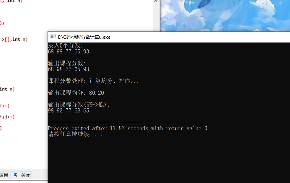 #include <stdio.h> #define N 5 void input(int x[], int n); void output(int x[], int n); double average(int x[], int n); void sort(int x[], int n); int main() { int scores[N]; double ave; printf("录入%d个分数:\n", N); input(scores, N); printf("\n输出课程分数: \n"); output(scores, N); printf("\n课程分数处理: 计算均分、排序...\n"); ave = average(scores, N); sort(scores, N); printf("\n输出课程均分: %.2f\n", ave); printf("\n输出课程分数(高->低):\n"); output(scores, N); return 0; } void input(int x[], int n) { int i; for(i=0; i<n; ++i) scanf("%d", &x[i]); } void output(int x[], int n) { int i; for(i=0; i<n; ++i) printf("%d ", x[i]); printf("\n"); } double average(int x[],int n) { int i; double sum=0,ave; for(i=0;i<n;i++) sum=sum+x[i]; ave=sum/n; return ave; } void sort(int x[],int n) { int i,j,k; for(i=0;i<n-1;i++) { for(j=0;j<n-1-i;j++) { if(x[j]<x[j+1]) { k=x[j]; x[j]=x[j+1]; x[j+1]=k; } } }
