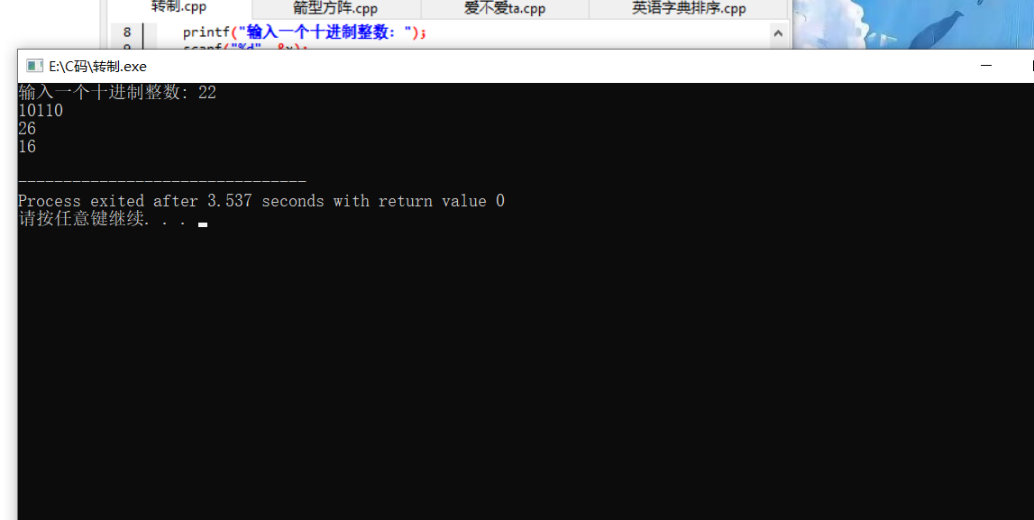 #include <stdio.h> void dec2n(int x, int n); int main() { int x; printf("输入一个十进制整数: "); scanf("%d", &x); dec2n(x, 2); // dec2n(x, 8); dec2n(x, 16); return 0; } void dec2n(int x, int n) { int a[80]; int i, j=0, k; do { i=x%n; a[j]=i; j++; x=x/n; } while(x); for(k=j-1;k>=0;k--) { if(a[k]>9) printf("%c",a[k]-10+'A'); else printf("%d",a[k]); } printf("\n"); }